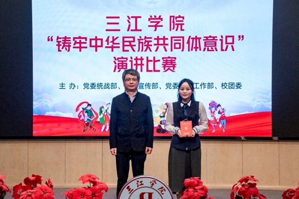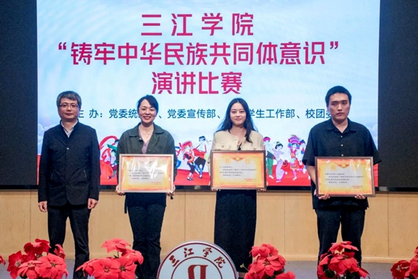 为进一步加强学校铸牢中华民族共同体意识教育,根据江苏省第一届“铸牢中华民族共同体意识·高校在行动”系列活动相关工作要求,校党委统战部、党委宣传部、党委学生工作部、团委联合举办三江学院“铸牢中华民族共同体意识”主题演讲比赛,经过各二级学院初选和推荐,校级演讲比赛于10月11日晚在学术报告厅拉开帷幕。校党委副书记沈军军出席并担任评委,校党委委员、党委统战部部长李云涛,党委学生工作部部长周学军、团委书记鲁璐、党委宣传部副部长吴江、建筑学院党总支副书记谢胜越、文化产业与旅游管理学院党总支副书记吴明明等担任评委,共12名学生选手参赛,全校200余名师生现场观看。