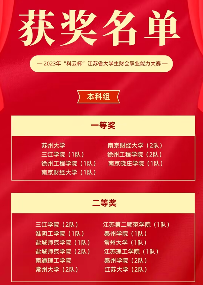 10月28日,在江苏大学举办的2023年“科云杯”江苏省大学生财会职业能力大赛中,我校法商学院两支队伍分获一等奖和二等奖的优异成绩。本次大赛共有苏州大学、南京财经大学、南京审计大学、江苏大学、扬州大学、常州大学、无锡太湖学院等49支本科院校队伍参赛。