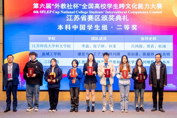 经过激烈的角逐,我校外国语学院王恩泽、文学与新闻传播学院周楚袖、高等职业技术学院姚梓贤三位同学在指导老师庆学先、何晴霞、杨卉卉的带领下最终荣获江苏赛区本科中国学生组二等奖。