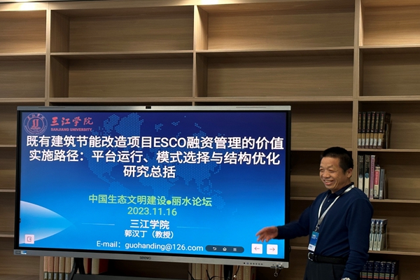 三江学院土木工程学院郭汉丁教授应邀参加了此次学术论坛,并在平行论坛三做了题为“既有建筑节能改造项目ESCO融资管理的价值实施路径:平台运行、模式选择与结构优化研究总括”学术报告。