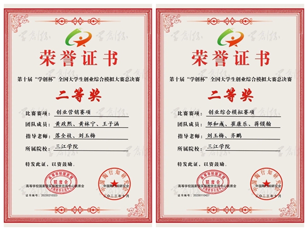 近日,2023年第十届“学创杯”全国大学生创业综合模拟演训活动(创业营销赛项、创业综合模拟赛项)总决赛在南京审计大学和黑龙江大学落下帷幕。全国共有1878所本专科院校、240436支队伍、979756名师生参与。在之前结束的江苏省选拔赛中,我校取得特等奖1项、一等奖1项、二等奖2项的好成绩。经过层层选拔,最终我校参赛团队在全国决赛中,荣获国家级奖项二等奖2项!其中黄政熙、黄林宁、王子涵三位同学组成的“营销鬼才”团队获2023“学创杯”创业营销赛全国总决赛二等奖;邹和彧、崔康乐、蒋镆翰三位同学组成的“听党指挥队”团队获2023“学创杯”创业综合模拟赛项全国总决赛二等奖。