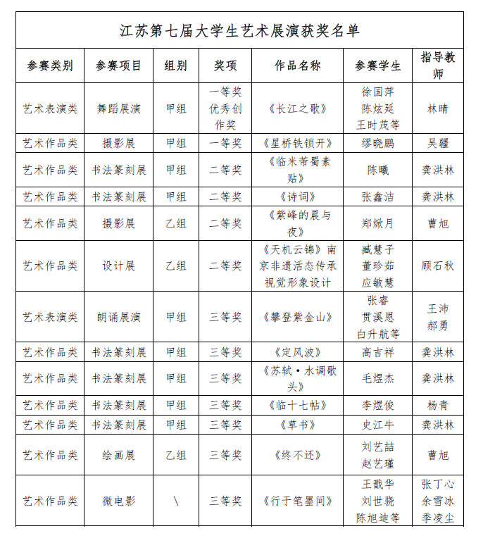 近日,由省教育厅主办的江苏省第七届大学生艺术展演活动正式落下帷幕。我校学生在本届艺术展演中参展了艺术表演类(舞蹈、朗诵)、 学生艺术作品类(绘画、书法和篆刻、摄影、设计、微电影)等七个展演类别项目的比赛。经过精心准备和激烈角逐,我校共获得一等奖2项、二等奖4项、三等奖7项、优秀创作奖1项的优异成绩。