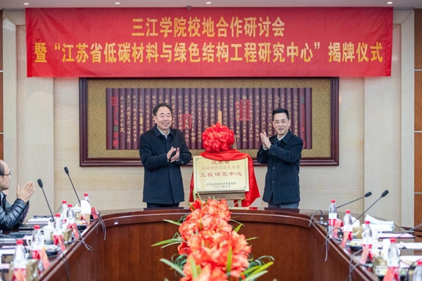 会上,雨花台区委副书记王金玉与我校理事长、党委书记封超年共同为“江苏省低碳材料与绿色结构工程研究中心”揭牌。