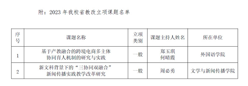 近日,江苏省高等教育学会发布了《关于公布2023年江苏省高等教育教改研究立项课题评选结果的通知》(苏高教会〔2023〕38号),我校《基于产教融合的跨境电商多主体协同育人机制的研究与实践》《新文科背景下的“三协同双融合”新闻传播实践教学改革研究》2项课题获得一般课题立项。