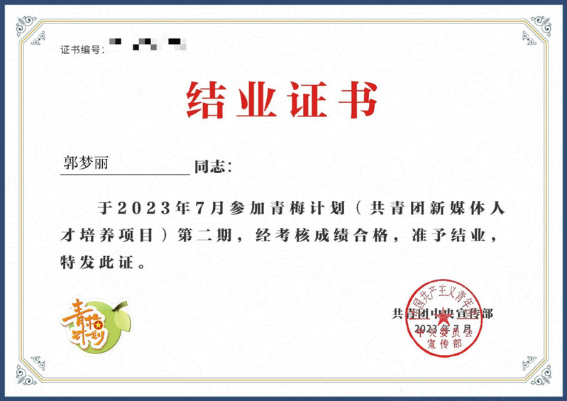 除了专业学习,她坚持在其他领域积极探索,现已取得GYB职业资格、会展职业经理人资质等,并于2023年完成共青团中央宣传部青梅计划新媒体人才培养项目。