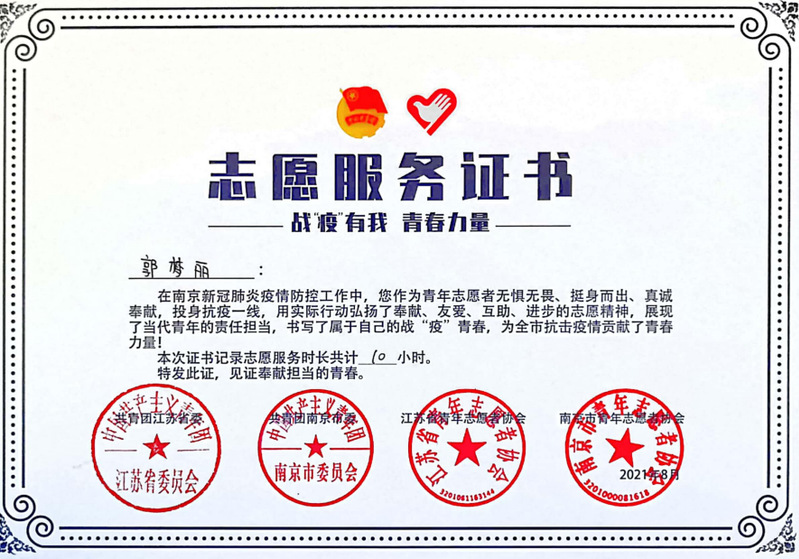 郭梦丽第一次参加志愿服务是在初一,那时候的她带领着班级的同学一起前往南京市城市书房进行志愿服务,她在那里整理书架、打扫卫生,也是在那里她第一次感受到了服务于他人的快乐。此后的日子里,她每次寒暑假都会参加志愿服务,到了高中时她终于成为了中国青年志愿者协会的一名注册志愿者。“赠人玫瑰,手留余香”,她享受志愿服务的过程,也很喜欢服务他人、帮助他人后的那种独一无二的快乐。疫情时,她于2021年7月21日南京爆发疫情第一天就从外地赶回南京,在高铁上申请加入玄武区青年志愿者先锋队,抵宁后她彻夜坚守疫情前线,协助医护人员完成市民的核酸检测。疫情后,她加入雨薇公益、小雨滴服务团、南京城市治理队等多个公益服务组织。无论酷暑与严寒,南京站、南京南站、河西大街、国际展览中心、乐高艺术展等地都曾有过她的身影。