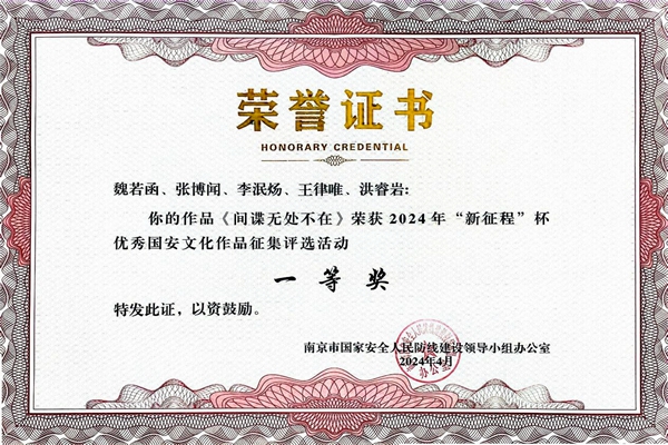 近日,南京市国家安全人民防线建设领导小组办公室通报了活动结果,我校文学与新闻传播学院魏若函、张博闻、李泯炀、王律唯、洪睿岩等5位同学联合参赛作品《间谍无处不在》系列短视频荣获2024年“新征程”杯优秀国安文化作品征集评选活动“一等奖”,三江学院获得2024年“新征程”杯国家安全主题宣讲比赛暨优秀国安文化作品征集活动“优秀组织奖”,据悉本次活动一等奖仅设1名且为最高奖项,优秀组织奖设5名。