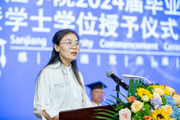 计算机科学与工程学院姚丽丽老师作为教师代表祝贺毕业生们顺利毕业,期许他们在求知道路上保持终身学习的态度、在工作上能够认真对待自己的职业生涯、在未来生活中保持积极向上的心态,愿学子们都有一个似锦的前程,常回母校看看,三江学院永远是你们的“快乐老家”。