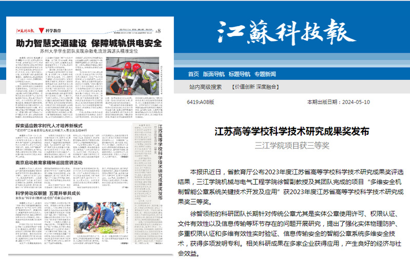 本报讯 近日,省教育厅公布2023年度江苏省高等学校科学技术研究成果奖评选结果,三江学院机械与电气工程学院徐智副教授及其团队完成的项目“多维安全机制智能公章系统关键技术开发及应用”获2023年度江苏省高等学校科学技术研究成果奖三等奖。
