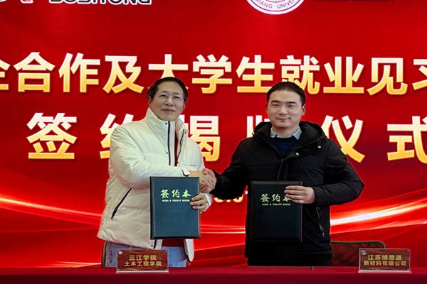 三江学院土木工程学院院长胡夏闽与江苏博思通新材料有限公司总经理胡凯伟分别代表校企双方签署了校企合作协议书