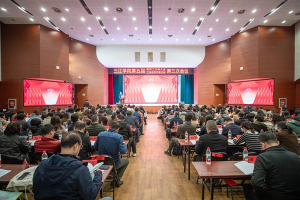 3月21日,三江学院第五届教职工代表大会第三次会议和工会会员代表大会第三次会议(以下简称“两代会”)在三江会堂召开。全体校领导,教代会、工代会全体正式代表和列席代表参加会议。