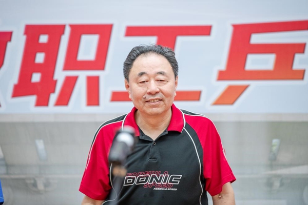 理事长、党委书记封超年与上届男子单打冠军郭汉丁老师开球