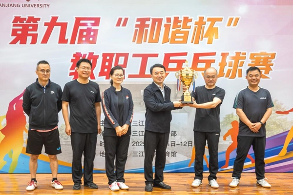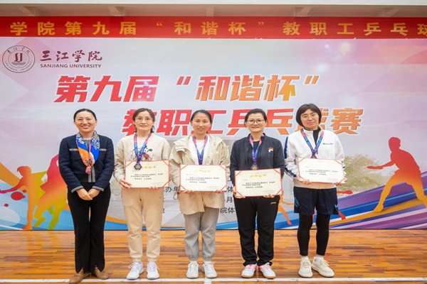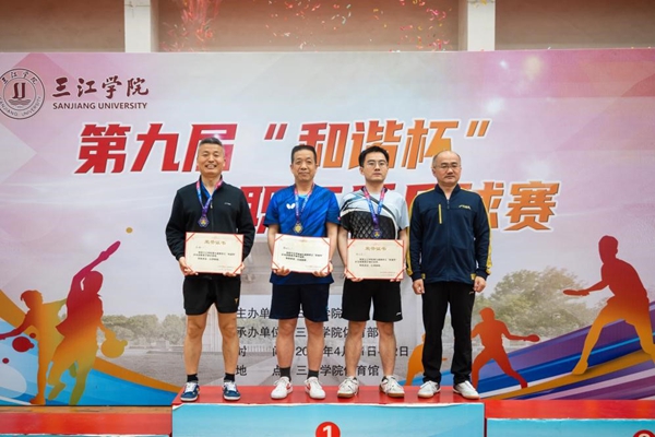 周更生、唐万宏、李云涛、杨业琴、季丹军为运动员颁奖。杨业琴宣布三江学院第九届“和谐杯”教职工乒乓球比赛闭幕。