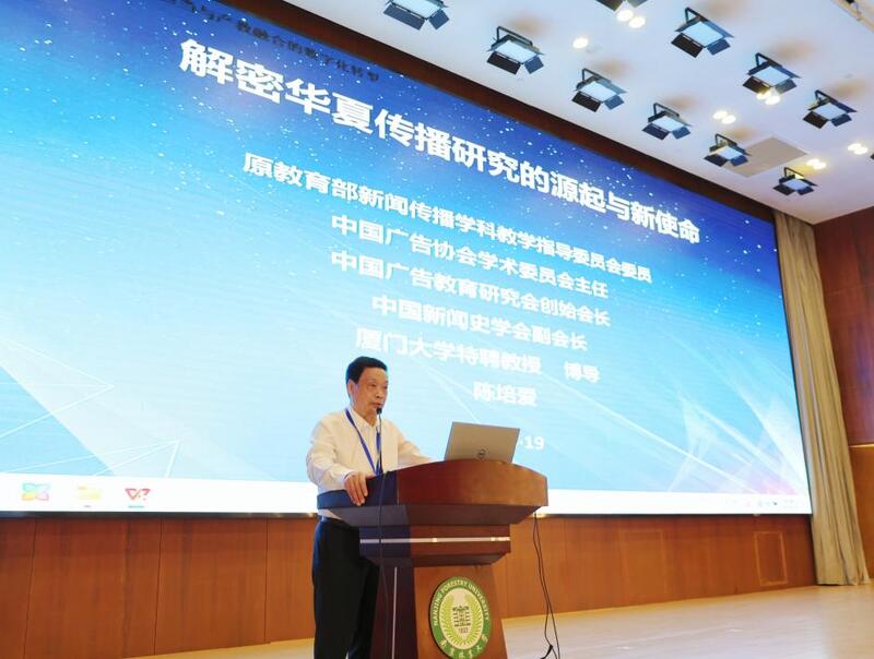 主旨演讲环节由三江学院文学与新闻传播学院副院长詹悦兰主持。厦门大学文科资深教授陈培爱以《解密华夏传播的源起与新使命》为题作主旨演讲,他回顾了华夏传播研究的开创历程,提出未来华夏传播研究还应在研究方向和实践层面有所突破,为文化传播注入新动能。