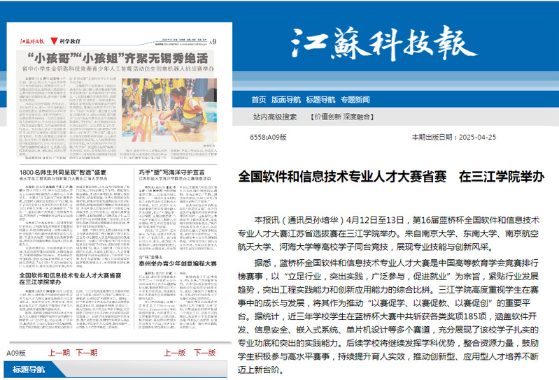 本报讯(通讯员 孙培华)4月12日至13日,第16届蓝桥杯全国软件和信息技术专业人才大赛江苏省选拔赛在三江学院举办。来自南京大学、东南大学、南京航空航天大学、河海大学等高校学子同台竞技,展现专业技能与创新风采。