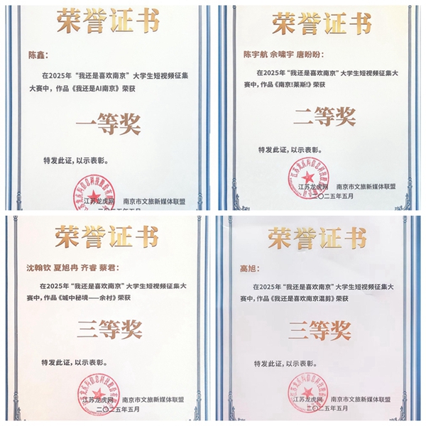 文学与新闻传播学院18位同学的参赛作品凭借独特的创意视角、精湛的艺术表达和深厚的文化内涵斩获多个奖项:陈鑫同学的《我还是AI南京》凭借新颖的创意、不俗的表现,荣获一等奖,她本人也被组委会聘为“南京文旅大学生推荐官”。陈宇航等同学共同完成的《南京!莱斯!》喜获二等奖。高旭同学的《我还是喜欢南京混剪》和沈翰钦等同学共同完成的《城中秘境——佘村》喜获三等奖。孙源权等同学共同完成的《汤山·春日记》和尤优等同学共同完成的《没有一只鸭子能够逃出南京》喜获综合传播奖。刘文欣等同学共同完成的《通感南京》喜获优秀奖。我校季丹军、巢小莉、赵丽江、王玥清、卢玉茹、王铁梅等多位老师在本次活动中荣获“优秀指导老师”奖。