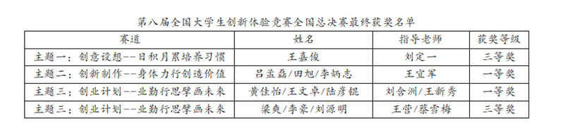 在刚刚落下帷幕的第八届全国大学生创新体验竞赛全国总决赛中,我校选送的三支参赛队伍表现优异,最终荣获全国一等奖2项,三等奖2项的佳绩,4名教师获“优秀指导老师”称号,学校荣获“优秀组织单位”称号。