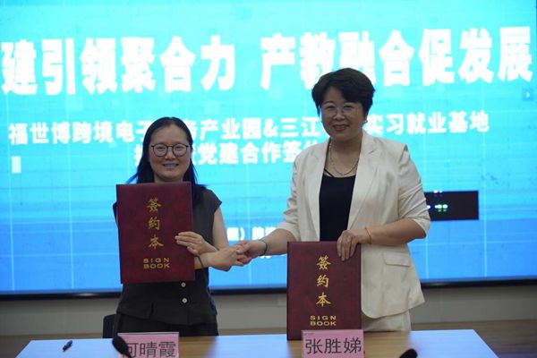 福世博跨境电子商务产业园党支部书记张胜娣与三江学院外国语学院英语系教师党支部书记何晴霞签订党建共建协议