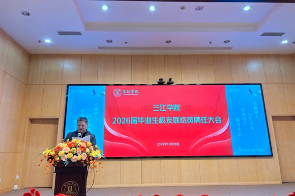 10月28日,三江学院2026届毕业生校友联络员聘任大会在学术报告厅顺利召开,三江学院校长助理、发展委员会(继续教育与培训处、校友会办公室)主任王勇教授,各二级学院分管校友工作负责人,以及169名新晋校友联络员们共同参会,大会由发展委员会(继续教育与培训处、校友会办公室)副主任吴朝军主持。