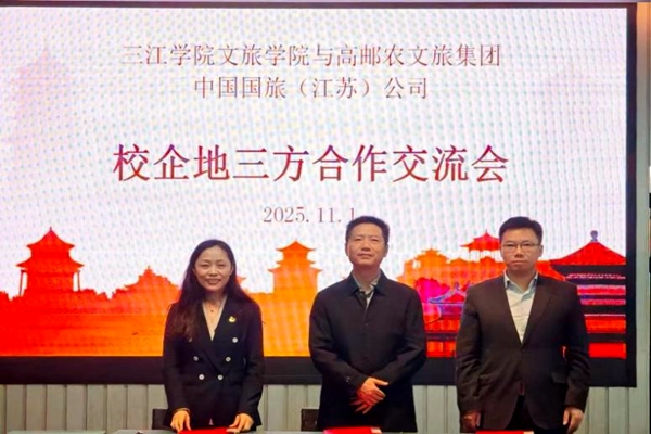 沈军军介绍了学校的办学特色与应用型人才培养定位。他强调,本次合作是深化产教融合、践行OBE理念的战略举措,通过引入中国国旅的行业实战资源与对接高邮独特的农文旅土壤,能够共同构建“人才培养共育、科研项目共研、产业发展共兴”的创新模式。他期待三方优势互补,不仅为学生拓展广阔的成才通道,更为服务地方、推动江苏文旅产业高质量发展贡献三江力量。
