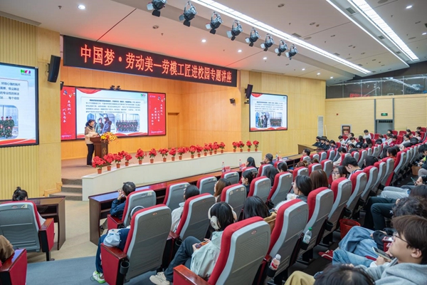 11月5日,由我校学生发展与服务中心、工会、发展委员会联合主办的“中国梦·劳动美——劳模工匠进校园专题讲座”在学术报告厅圆满举行。校长助理、发展委员会主任王勇,工会主席杨业琴及相关部门教师代表出席活动。活动由学生发展与服务中心主任周学军主持。150余名师生代表齐聚一堂,聆听劳模故事,汲取奋进力量。