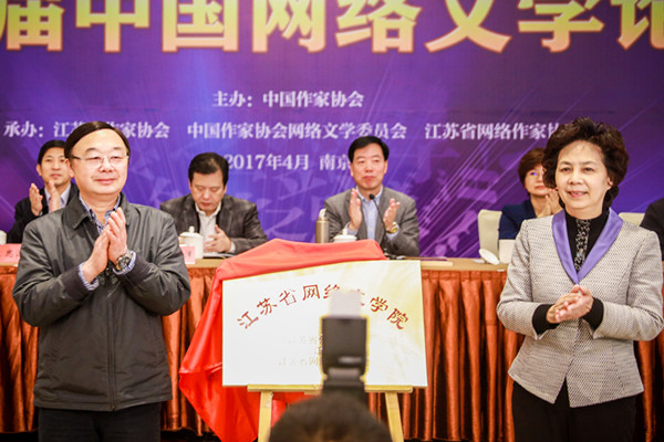 中国作协原副主席、网络文学委员会主任陈崎嵘致开幕词;中共江苏省委宣传部副部长徐宁致辞;江苏省作家协会主席范小青介绍江苏省网络文学工作情况。会上还隆重举行了“江苏省网络文学院”成立揭牌仪式,江苏省作家协会主席范小青与三江学院党委书记丛懋林为江苏省网络文学院揭牌,并向网络文学院特聘研究员颁发聘书。