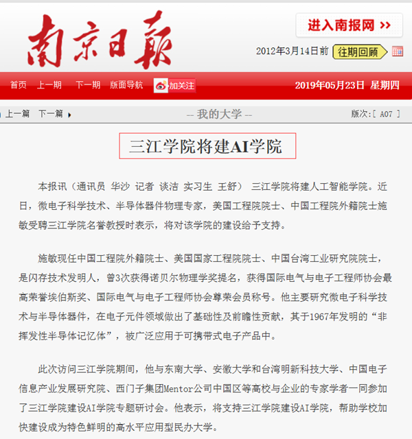 三江学院将建人工智能学院。近日,微电子科学技术、半导体器件物理专家,美国工程院院士、中国工程院外籍院士施敏受聘三江学院名誉教授时表示,将对该学院的建设给予支持。