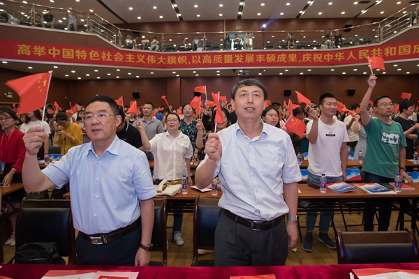 朗诵会现场挥舞国旗,齐声高唱《歌唱祖国》