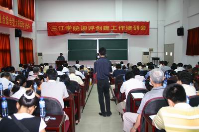 殷翔文副厅长在报告中高屋建瓴地指出:本科教学水平评估是高等教育发展的必然趋势,他指出,教学评估是手段而非目的,评估是一种压力也是一种机遇。殷厅长肯定了我校积极的姿态,同时指出我们要注意的几个问题:1、要坚持正确的指导思想,要注重练内功,做好基础性工作。2、对评估指标体系要全面衡量、准确把握、深刻理解,尤其是核心指标。3、经费投入要有保障。4、特色项目上要下功夫。他指出,迎评创建工作要成为校、院(系)的一把手工程,要抓好自评这个环节。殷厅长最后鼓励我校:“只要把压力变作动力,挑战变作机遇,只要我们保有这样一份饱满的精神状态,并有充分的准备,大家共同努力,三江的教学水平评估就一定能取得优异成绩,给我们江苏的父老乡亲交上一份满意的答卷,我们教育厅一定会尽最大努力给予支持。”