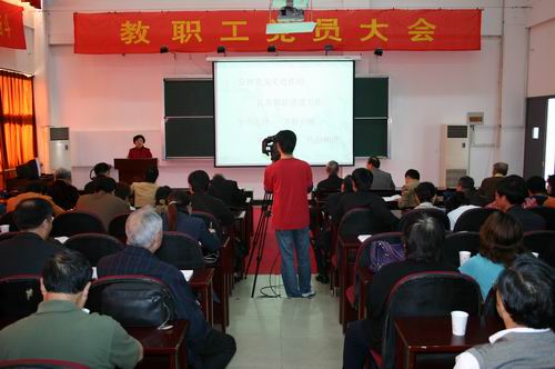4月20日下午,全校教职工党员在图书馆演讲厅召开大会,大会由党委副书记、副校长叶俊主持,陈万年书记出席会议并讲党课,大会贯穿着“发挥党员先锋作用、认真做好评建工作、争当先锋、多做贡献、推进发展、共创和谐”的主题。