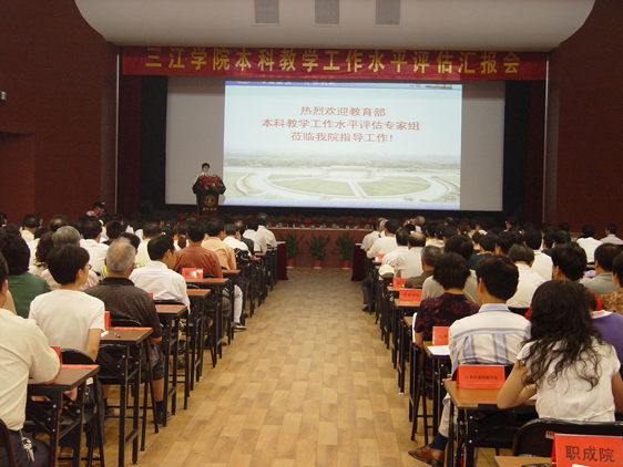 阳光明媚、万木葱荣的五月,美丽的三江学院校园内彩旗飘展,横幅高扬。三江学院全体教职员工带着喜悦和振奋的心情,迎来了5月27日—6月1日这段令全体三江人振奋的日子。5月28日上午9:15分——10:25分,三江学院在“三江会堂”举行了本科教学工作水平评估汇报会。教育部评估中心院校评估处刘振天处长,省教育厅高教处王煌处长,本科教学工作水平评估专家组以及三江学院院领导、院中层干部、师生代表等出席了汇报会。