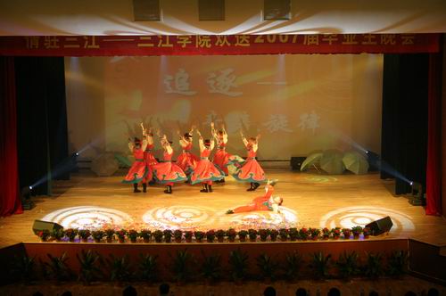 第二篇章中情景剧《回眸三江》,带领着观众再次走过三江的各个角落。军训的时光,抛起学士帽的一刻,一个是开始,一个已经是结束。第三篇章,在收获的六月,毕业生代表用手中的笔写下对三江的最真诚也最深刻的眷恋。五位校领导也回赠了毕业生中国结,并且写上了共勉的祝福语,其中陈万年校长深情写到:“三江学子前程似锦,情驻三江万年常青。”现场的毕业生也被校长的真情打动,一些同学小声呼唤起来:“万年,你好!”,同学们也见证了再造新三江的历程,同学们那贴心的话语,像是在跟老朋友打招呼,平静的语调里却洋溢着敬爱之情。 在《举杯吧,朋友》的歌声中,晚会顺利地闭幕。