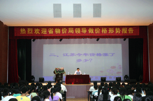 9月27日18时,经济系在三江会堂举办了一场别开生面的学术报告,邀请江苏省物价局孔祥平副局长为大家分析了2007年江苏的价格形势。报告由经济系周敏倩主任主持,骆志斌常务副校长首先作了欢迎词,教务处赵连泽处长、学报编辑部郑毅主任出席,以经济系为主的近800名师生聆听了学术报告。
