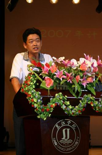 9月28日晚上6点30分,主题为“新的血液 新的梦想”的计算机系迎新生庆国庆文艺晚会在三江会堂举行。副校长、计算机系主任、软件学院院长王芝庆、以及计算机系、软件学院的其他领导王成均、佟振明、叶传标出席并在前面就坐。文艺节目开始前的入学教育分五项内容,由佟振明副主任主持。王芝庆副校长就专业教育进行了生动而亲切的讲话,王成均副主任宣读了计算机系英语四六级考试成绩表彰名单。教师代表、老同学代表、新生代表依次发言。随后,舞台的帷幕徐徐拉开,学校大学生艺术团的劲舞《ten minutes》把会场气氛顿时导入演出氛围。晚会分三个部分——今天、明天、后天,三副对联把整个晚会很好地串联:今天——迎新生笑逐颜开喜相逢,庆国庆百花齐放乐开怀;明天——看今朝莘莘学子,盼明日济济人才;后天——山美水美花美草美校园处处堪称美,天新地新人新事新师生个个喜迎新。这些对联分别成为每场设计独到、典雅的舞台背景上的文字主题,让人感受到组织者的匠心独到。民族舞《家乡美》清灵柔美,动漫表演《COSPLAY》滑稽搞怪,古筝演奏《雪山春晓》音色流美……,计算机系的这台晚会不止反映了计算机系师生的人才济济,还反映了一种和谐和凝聚。8点30分左右,晚会在大合唱《我们是一家人》中落幕,计算机系、软件学院的领导走上舞台亲切慰问演职同学,并与大家合影留念。