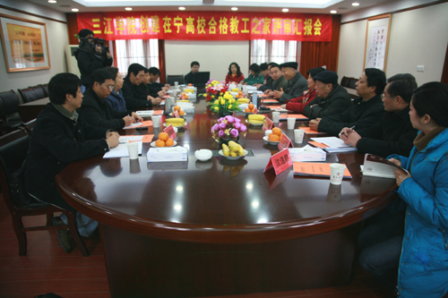12月17日上午,在我校行政楼101会议室举行了我校创建在宁高校“合格教工之家”评审汇报会。莅临我校评审的有:省教育科技工会副主席张辉,省教育科技工会高校部部长华翼扬,南京航空航天大学工会主席田永和,南京大学工会主席张厚森,南京工业大学工会主席杨兴南,省教育科技工会高校部高顺岭。我校校长陈万年,副校长、校工会主席叶俊,校(党)办主任、校工会副主席周更生,校工会委员郭子亭、王勇、郭红、邢晓刚、周建华、沈逸君及后勤分工会主席旺新出席汇报会。