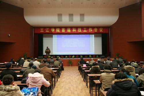 科技处陈昌柏处长首先作《努力开创三江学院科研工作新局面》的报告。报告指出:高等学校承担着教学和科研的双重任务,三江学院虽然是民办本科院校,但是,国家在对普通本科高校的科研工作要求和目标上并没有做出任务区分。我们不能认为自己是民办高校而放松对科研工作的要求。从学校长远发展的观点思考,民办本科院校也应该争取达到国家对普通本科院校科研工作的目标要求。报告从承担科研任务的情况、科研队伍、科研基础设施建设、全院师生员工的科研意识明显提高三个方面回顾了三年来的科研工作,三年来我校科研工作在纵向科研和横向科研等方面都取得了非常突出的成绩。在报告的第二部分,对今后科研工作提出了很多有意义的思考。既有科研工作的宏观目标又理清了我校科研工作的思路,提出我校目前的科研策略应该是纵横结合、以横为主,既要积极争取纵向课题,又要务实地面向基层、面向企业,走产学研合作的科研道路。报告对近期加强科技工作提出了若干很有价值的建议,提出要制定加强对科研工作成绩出色人员的奖励政策,要落实科研编制,要完善科研论文、作品等科技成果的奖励办法,要加强各院(系)、基础教学单位对科研工作的领导,要进一步加大对科研的经费投入。报告指出现阶段科研工作的重点:文管类学科应该以文化创意产业和企业战略管理研究为重点,理工类学科要走产学研合作的道路,以科技攻关为重点。学校对院(系)和基础教学单位承接的科技项目要实行优先扶持政策,确保项目的顺利实施并取得预期的成果。报告还提出了我校科研工作存在的一些问题。随后有五位老师向大会作了关于本院系科研工作的报告,阐述了对科研工作的认识和自己的特色做法以及已有的成绩。他们是电气工程学院王尧、电子信息工程学院范寿康、旅游学院郑云波、计算机系叶传标、中文系韩雪临。五位老师的报告结束后,骆志斌常务副校长宣读了表彰“三江学院优秀科技工作者”的决定,张燕 、贺文、张家海、顾永芝、田长广、陈昌柏、王尧、张安康?、杨少雄、邢晓刚上台接受陈万年校长的颁奖。