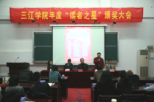 颁奖会由高沨老师主持,到会的领导有:常务副校长骆志斌、宣传部长王勇、学工部部长朱银亮、馆长包忠文、副馆长陈馥瑛。另有获奖读者、读书会员、各院系学生代表100多人参加会议。