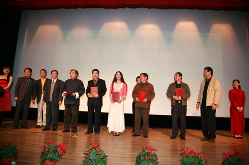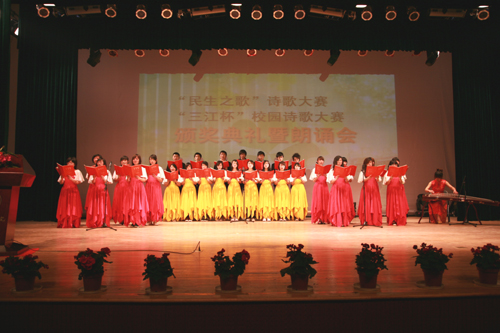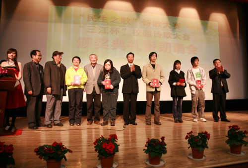 在欢快的乐曲声中,举行了隆重的颁奖仪式,其间,诗人代表叶文福上台讲话,他“以诗代言”,精彩的朗诵赢得了在场师生的阵阵掌声。随后,本次“民生之歌”诗歌大赛的积极倡导者、赞助者北京德恒投资有限责任公司董事长、著名诗人周庆荣先生讲话。周庆荣先生说,他很荣幸地能参与协办江苏省作协和扬子江诗刊社所倡导的有关“民生”这一主题的诗歌活动,他说,人生总要经历几次大的感动,因为平凡而感动,他感动于故乡,感动于江苏省作家协会所倡导的“民生”主题,他会用一辈子的时间来体验平凡的生活,并创造、感受、欣赏平凡的人生风景。