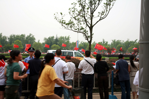 为了迎接圣火,三江学院组织了将近2000名学生前去参观圣火的接力。我们早早的就来到了圣火的第一站——奥体中心,那里早已经热情一片了。红旗,五环,福娃,奥运会徽随处可见。据了解,今天早上6点前,所有传递路线都已经被清扫、冲洗一遍,保证了道路“一尘不染”。全体参与交通保障的交警今天一早也提前就位。离圣火传递开始还有2个小时,人们早已守候在道路两旁,生怕错过这一辉煌的一刻。