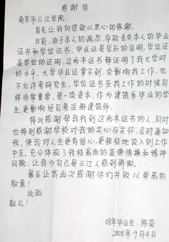 近日,我校后勤集团收到一封来自我屠宏春同学的一封感谢信,对我校后勤员工拾金不昧的行为表示感谢。他在感谢信中说,后勤员工的这种拾金不昧的高尚品质令我们三江每一位同学深深敬佩。同时,他也感谢三江后勤集团,因为后勤集团有这样的优秀员工,才使广大同学感到安全和舒适。