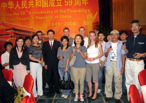 金秋时节,适逢中华人民共和国成立59周年,我省副省长张卫国代表省长罗志军在招待会上致辞,对关心支持江苏经济社会发展的外国专家、国际友人、港澳同胞、台湾同胞和海外侨胞表示衷心感谢。我校日语外教曾田和子、曾田康载、久崎礼子、石川刚、神田耕太郎、河本雅明,韩语外教朴志恩,英语外教Andrew Bracher、Gareth Tristan Kay、Rhys Iaian Kay、Steven Diamond、Brooke Stedman等出席了招待会并与张卫国副省长合影留念。