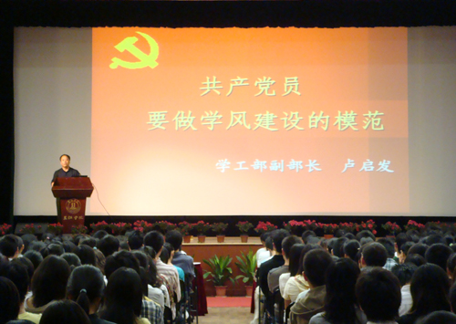 为了增强党性,整顿党风,促进学风建设。9月27日晚我校组织召开学生党员大会。学生工作部副部长卢启发同志给我校684名学生党员上了一次“共产党员要做学风建设的模范”的主题党课。