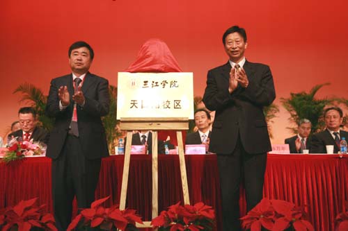 18日上午的校庆庆祝大会上,溧阳市天目湖旅游度假区天目湖玉枝特种茶果园艺场董事长濮爱玉与三江学院理事长、院长、党委书记陈万年为三江学院天目湖校区揭牌。