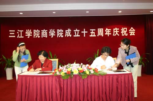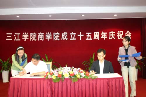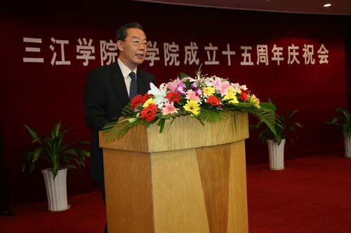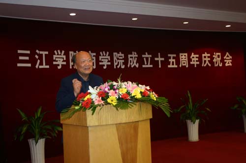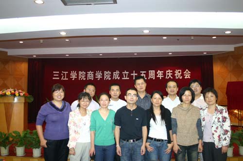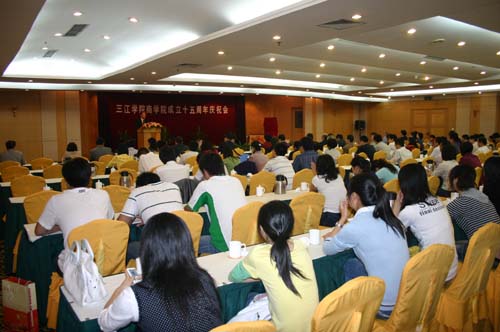 10月18日下午2:00,三江学院商学院(原工商管理系)成立15周年庆祝大会在翠屏山宾馆隆重举行。出席此次庆典活动的有三江学院理事长、校长、党委书记陈万年,原三江学院副校长、工商管理系系主任、现三江学院副理事长冯沪生,党委副书记、副校长、工会主席叶俊,党委副书记、副校长董新华,新街口百货股份有限公司党委书记陶佩芬女士,校办、党办主任周更生,教务处处长赵连泽,设备处处长曾凡捷,学校各职能部门的相关领导,老教师代表,校友,商学院领导及全体教师及部分学生代表。