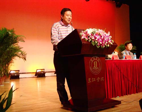 “时光荏苒十五秋,王公营运志方猷;三江电算多才俊,敢与强者竞风流;遥想当年湖荫处,筚路蓝缕情意稠;借问访家前程事,更上学阶一层楼。”我院学生钱亚艺朗诵了这首由三江老人丁承憼敬撰的《古风一首》。全诗洋溢着丁老对三江的深情厚爱,并表达了他对我院更加强大的美好憧憬。正值院庆之际,我院1993级毕业生谢康与2004级毕业生,现任泰州兴化市村官吴向东均上台发言,这两位校友凭借其在学校所学到的扎实的专业知识、沉稳的为人处世和集体生活能力,毕业后打造出了自己的一片事业,激情地发言中,不时流露出对我院的怀念与不舍,并对其学弟学妹们提出了殷切的期望。随之,我院教师代表刘正涛老师上台发言,“愿计算机科学与工程学院的明天更加辉煌!”充分表达了我院全体教师对我院的热爱与共同努力的信念。2005级学生代表凌定娇的发言中,一句“在今后的路上,无论我们走多远,飞多高,三江学院计算机科学与工程学院永远是我们心灵的归宿”充分抒发了我院学生对我院深深的热爱之情。