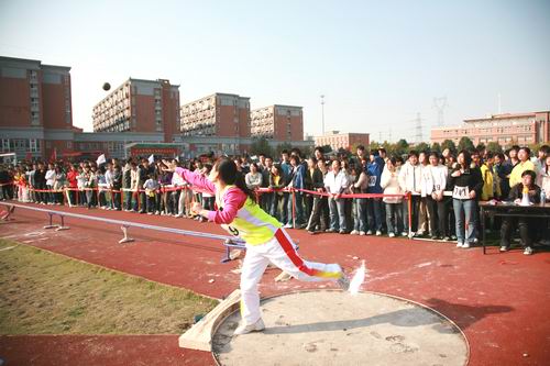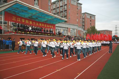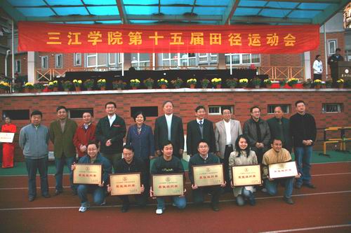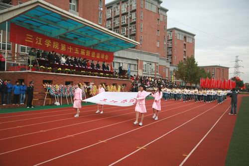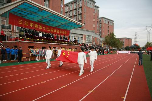 11月8至9日,我校第十五届田径运动会在田径场举行, 8日上午8点,运动会开幕式正式开始,陈云棠副校长主持开幕式,国旗队、校旗队、红旗队、鲜花队方阵以及各院(系)运动员方阵陆续入场,运动场洋溢着欢快、喜庆的气氛。8点30分,全体师生面向国旗庄严举行升旗仪式。董新华副校长致开幕辞,他在开幕辞中说:“今年我国成功举办了第29届奥林匹克运动会,在北京奥运会上,我们看到了奥运健儿奋勇争先,顽强拼搏,挑战生命极限的精彩。在这金风送爽、硕果累累的秋天,我们刚刚举行了15周年校庆,今天又满怀喜悦地迎来了第15届田径运动会的隆重开幕。请允许我代表本届大会组委会,对运动会的顺利召开表示热烈的祝贺!对为本次体育盛会的筹备工作付出辛勤劳动的老师们、同学们表示衷心的感谢!”,他指出:“学校体育是全面发展教育的重要组成部分,发展体育运动,有利于增强师生体质,促进师生身心健康发展,也是我们每个人学习科学文化知识、进行社会实践和完成工作任务的有力保证。运动会的举办,既是对我校同学们的体育运动水平和体育运动成绩进行一次大检阅,也是全校师生道德品质、思想作风、精神面貌和校风校纪的一次大展示。运动会的举办,必将进一步促进学校群众性体育活动的开展,推动教育部“阳光体育”工程的实施,激励师生积极锻炼身体,提升学校体育工作的水平。”