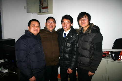 副校长董新华及宣传部部长王勇与二位创业者合影