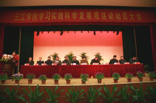 随后,陈万年校长发表了题为《深化教育教学管理体制和投资体制改革 推进学校事业持续科学发展》的重要讲话。他说,根据中央和省委部署,按照省委教育工委关于高校开展深入学习实践科学发展观活动的安排,今天,我们在这里召开三江学院深入学习实践科学发展观活动动员大会,主要任务是认真学习贯彻中央和省委关于开展深入学习实践科学发展观活动的重要精神,贯彻落实省教育工委对高校开展深入学习实践科学发展观活动的具体要求,对我校开展深入学习实践科学发展观活动进行动员和部署。整个学习实践活动紧紧围绕“深化教育教学管理体制和投资体制改革,推进学校事业持续科学发展”的主题开展。陈万年校长谈了三点意见:其一,希望大家深刻领会开展深入学习实践科学发展观活动的重要意义,这也是我校为什么要开展学习实践活动的原因;其次,扎扎实实抓好学习实践活动“三个阶段六个环节”的工作;其三,加强领导,确保学习实践活动取得实效。陈万年校长说,开展深入学习实践科学发展观活动,既是对各级领导班子和党员领导干部的一次深刻教育和考验,也是对各级领导班子和党员领导干部执政能力、治校能力的有力促进和提高。我校一定要坚持以邓小平理论和“三个代表”重要思想为指导,深入贯彻落实科学发展观,以改革创新、求真务实的精神,积极探索,勇于实践,确保学习实践活动取得实实在在的成效,为推动学校教育事业又好又快发展作出新的贡献。