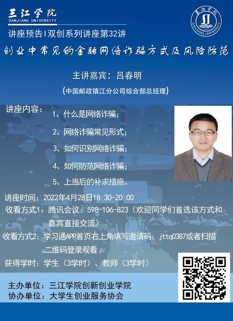讲座预告丨三江学院双创系列讲座第32讲——创业中常见的金融网络诈骗方式及风险防范