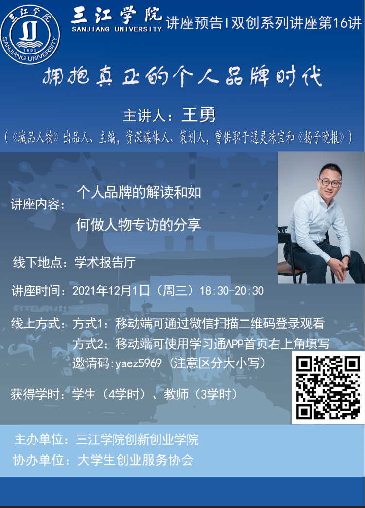 讲座预告丨三江学院双创系列讲座第16讲—— 拥抱真正的个人品牌时代